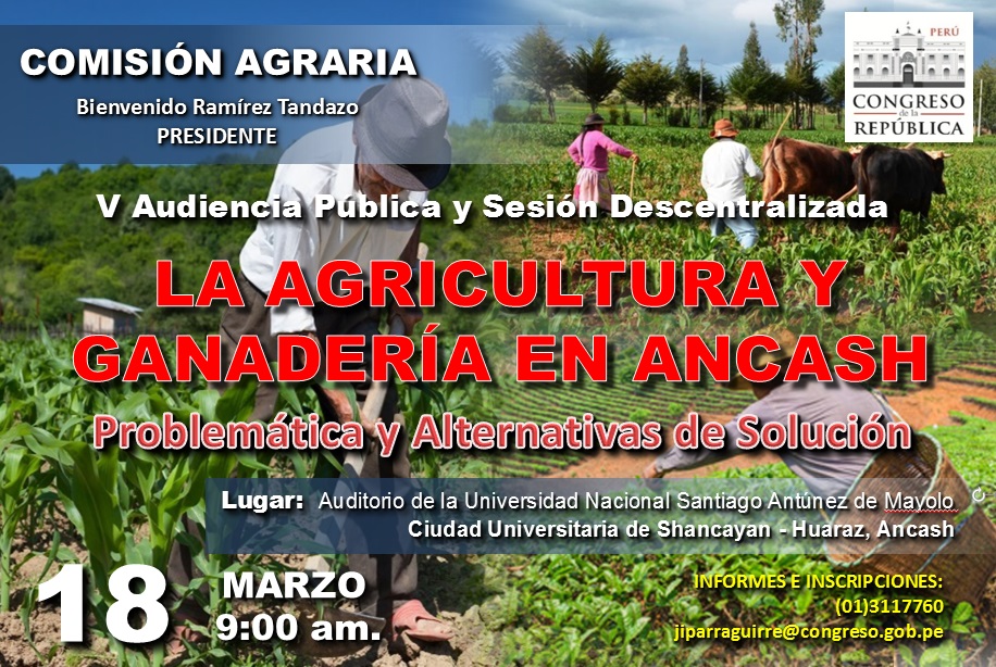 El congresista Bienvenido Ramírez Tandazo, Presidente de la Comisión Agraria, convoca a la V Audiencia Pública y Sesión Descentralizada en la ciudad de Huaraz, departamento de Ancash, y hace extensivo la invitación a las organizaciones de la sociedad civil, a los agricultores, a los ganaderos, a los gremios, a los empresarios, a las autoridades y funcionarios de la administración pública a efectos de informar sobre: (1) problemática del sector agrario de Ancash, (2) situación del sector ganadero, problemática , desafíos y acciones a implementar en Ancash; e, (3) impacto de las sequías y heladas en el sector agropecuario. |