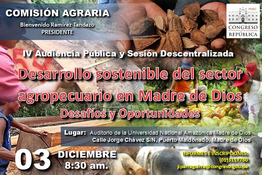 El congresista Bienvenido Ramírez Tandazo, Presidente de la Comisión Agraria, convoca a la IV Audiencia Pública y Sesión Descentralizada en la ciudad de Puerto Maldonado, departamento de Madre de Dios, y hace extensivo la invitación a las organizaciones de la sociedad civil, a los agricultores, a los ganaderos, a los gremios, a los empresarios, a las autoridades y funcionarios de la administración pública a efectos de informar sobre: (1) problemática del sector agropecuario de Madre de Dios, (2) problemática del sector forestal, desafíos y acciones a implementar en Madre de Dios; e, (3) impacto de la minería en el sector agropecuario y forestal. |