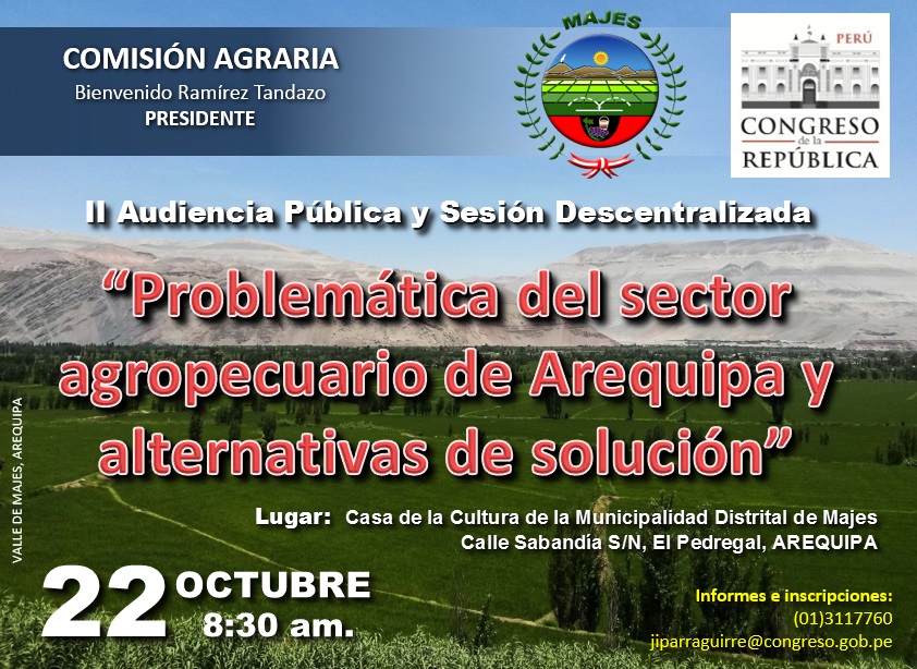 El congresista Bienvenido Ramírez Tandazo, Presidente de la Comisión Agraria, convoca a Audiencia Pública y Sesión Descentralizada en el departamento de Arequipa y hace extensivo la invitación a las organizaciones de la sociedad civil, a los agricultores, a los ganaderos, a los gremios, a los empresarios, a las autoridades y funcionarios de la administración pública a efectos de informar sobre: (1) problemática del sector agrario de Arequipa, (2) problemática del sector pecuario de Arequipa, (3) evaluación de los recursos hídricos de Arequipa; y, (4) la situación y perspectivas del Proyecto Especial Majes Siguas. |