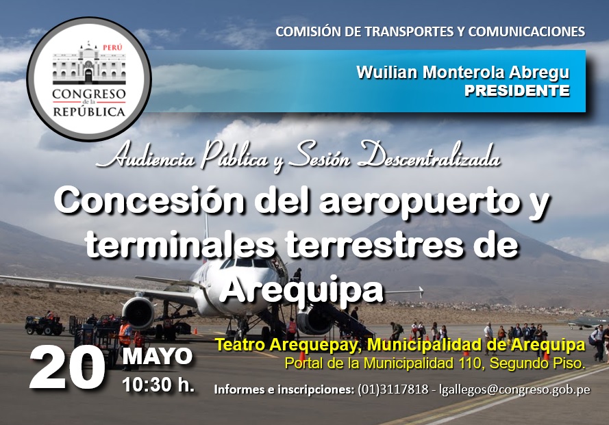 El congresista Wuilian Monterola Abregu, Presidente de la Comisión de Transportes y Comunicaciones, convoca a la Audiencia Pública y Sesión Descentralizada, "Situación de la concesión del aeropuerto y terminales terrestres de Arequipa", a las organizaciones de la sociedad civil, a los gremios, a los empresarios, a las autoridades y funcionarios de la administración pública, a fin de recibir informes y opiniones respecto a la problemática del transporte, terminales terrestres, infraestructura vial y situación de la concesión del aeropuerto de Arequipa, y las acciones realizadas por el gobierno nacional, regional y local para dar solución al problema y minimizar el impacto en los sectores productivos y en la población. DATOS DEL EVENTO: |