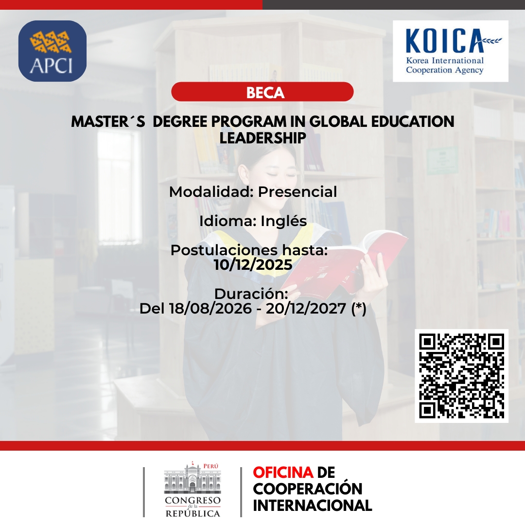 Corea - Master´s Degree Program in Global Education Leadership Se informa al personal parlamentario sobre la convocatoria al Programa de Maestrías 2026 ofrecido por la Agencia de Cooperación Internacional de Corea (KOICA), en modalidad presencial, correspondiente al “MASTER´S DEGREE PROGRAM IN GLOBAL EDUCATION LEADERSHIP” en Korea University of Education, en el marco del Módulo de Becas Internacionales. Sintesis de la información de la beca en la web de la fuente cooperante KOIKA. Modalidad: Presencial Duración: Del 18/08/2026 - 20/12/2027 (*) La duración está sujeta a cambios, dependiendo de las circunstancias de la institución Korea National University of Education. Además, puede haber un semestre previo al inicio del programa. Fecha límite de postulación: hasta 10/12/2025