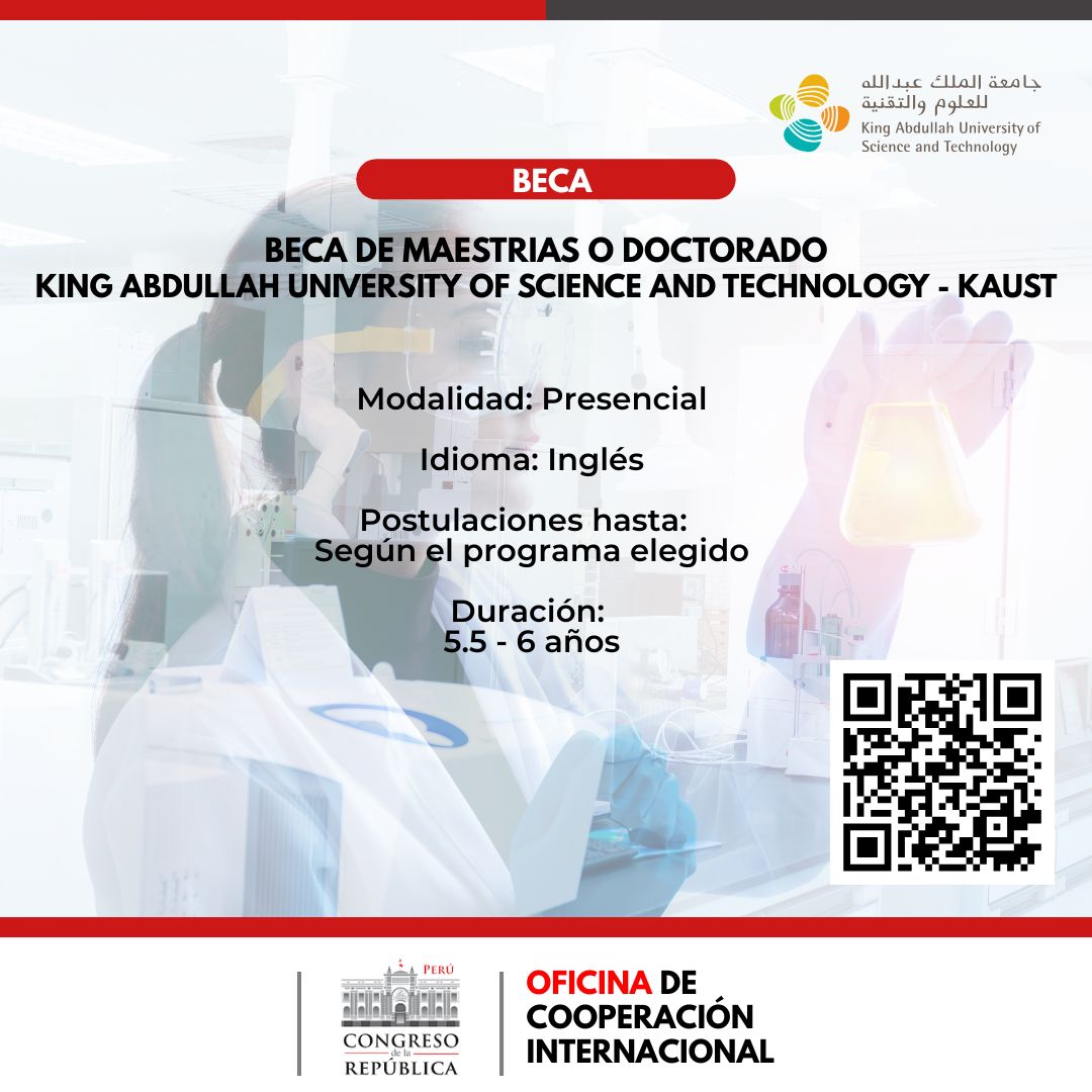 Arabia Saudita - Becas por Maestría/Doctorado King Abdullah University Of Science And Technology - KAUST KAUST o King Abdullah University of Science and Technology ofrece la oportunidad de postular a seguir una Maestría o Doctorado de forma presencial en diversos programas (enlace con información general). Todos los estudiantes admitidos reciben el KAUST fellowship (beca), excepto quienes son subvencionados a tráves de algún programa externo. Para postular debes registrarte o crear una cuenta. De ser admitido los detalles de la KAUST Fellowship serán enviados por correo. La KAUST Fellowship ofrece cubrir la matrícula, el alojamiento, el seguro médico, el apoyo para la reubicación, entre otros beneficios adicionales. Modalidad: Presencial Duración: 5.5 a 6 años Fecha límite de postulación: Según cada programa