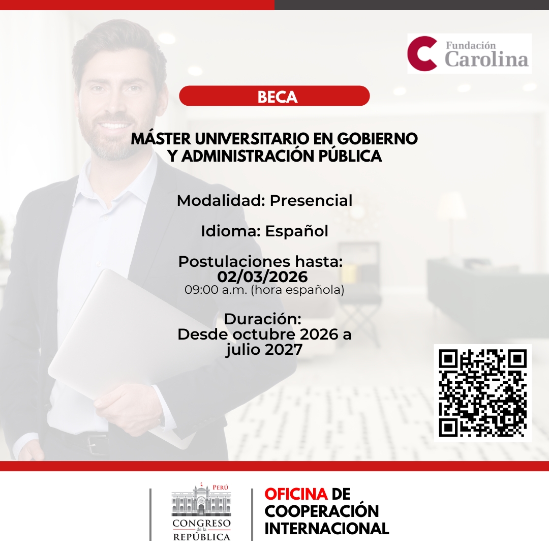 España - Fundación Carolina "Máster Universitario en Gobierno y Administración Pública" El Programa ofrece un conocimiento sistemático y profundo de la Ciencia Política y de la Administración a graduados interesados en una especialización en esas materias, bien con fines académicos o profesionales. Durante este Máster se estudian los grandes pilares del Gobierno y la Administración Pública. Se presentan y examinan, desde un punto de vista crítico, los aspectos necesarios para enfrentar con éxito cualquier cuestión con relevancia política y administrativa que los alumnos necesiten resolver o tratar. Se trata de ofrecer una visión general sobre el proceso de toma de decisiones al interior de un sistema político, y a la vez profundizar en materias sustantivas como la administración pública o las políticas públicas, con el objeto de que los alumnos lo perciban y dominen en su complejidad. El curso es impartido por la siguiente institución: Instituto Universitario Ortega-Marañón (Madrid) Se recomienda visitar la página web de la Fundación Carolina para revisar la lista total de programas disponibles (Sección: Postgrado / Paz, justicia e instituciones sólidas). Asimismo, es importante revisar la sección Cómo solicitar una beca de Fundación Carolina. Modalidad: Presencial Duración: De octubre de 2026 a finales de julio de 2027 Fecha límite de postulación: 02/03/2026, 9:00am (hora española)