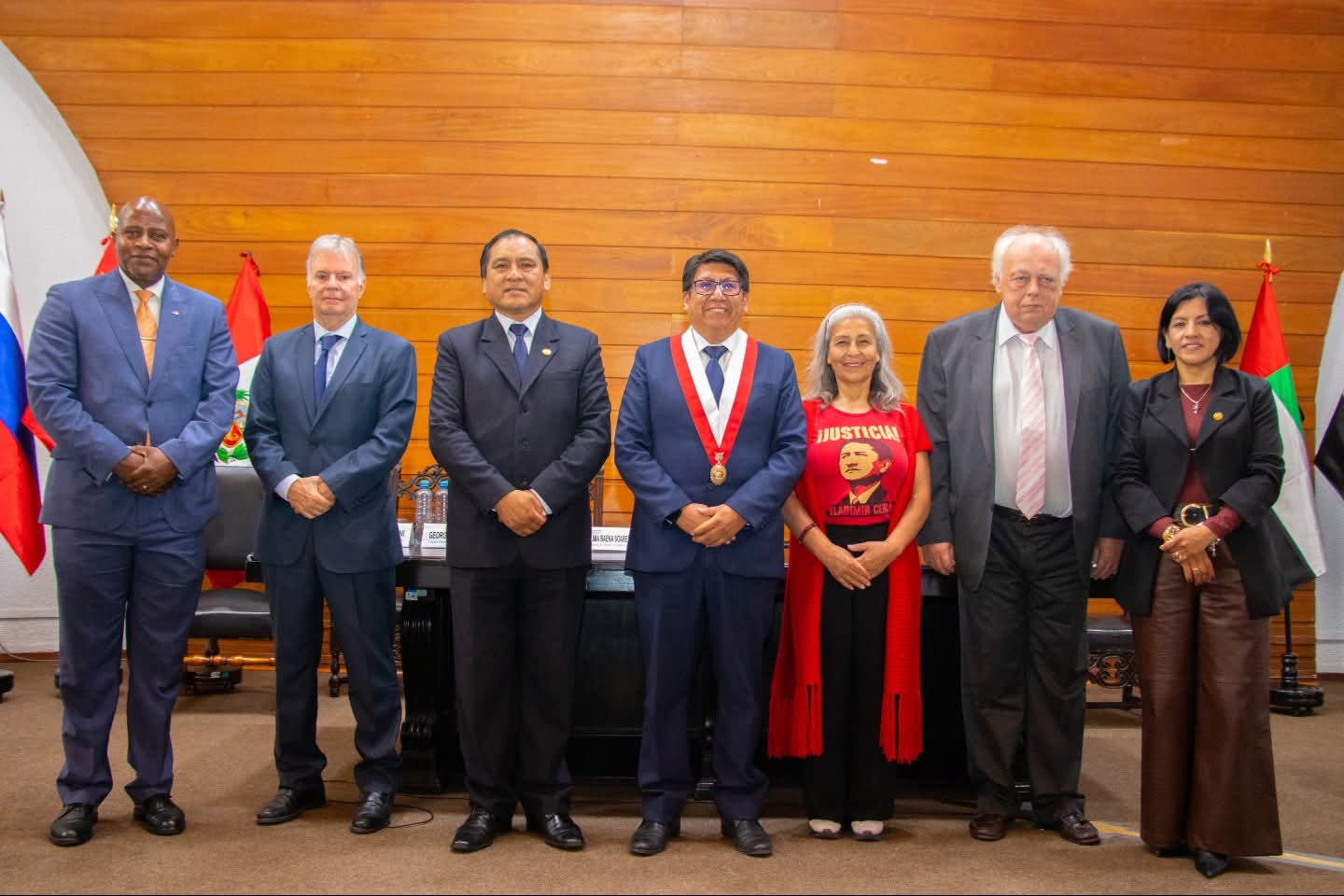 El Segundo Vicepresidente del Congreso de la República del Perú Dr. Waldemar Cerrón Rojas, la Jefa de la Oficina de Cooperación Internacional Ing. Carina Palacios y el Jefe de la Oficina de Asesoramiento Científico Dr. Lizardo Chachi participaron en el conversatorio con la delegación de la Universidad China de Ciencias, Política y Derecho de la República Popular de China, donde asistieron: