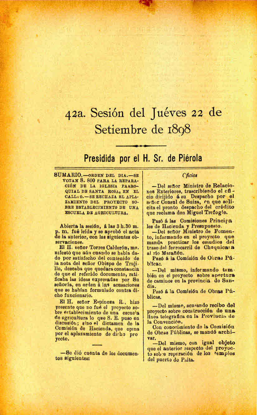 | 45ª Sesión del jueves 29 de setiembre de 1898 | 46ª Sesión del viernes 30 de setiembre de 1898 |