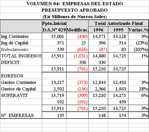 Mediante D.S. Nº 029-96-EF se aprueba el Presupuesto Consolidado de Ingresos y Egresos de la Actividad Empresarial del Estado, bajo el ámbito de la Oficina de Instituciones y Organismos del Estado-OIOE y CONADE, determinando un Marco Legal de 135 empresas, según se sintetiza a continuación: