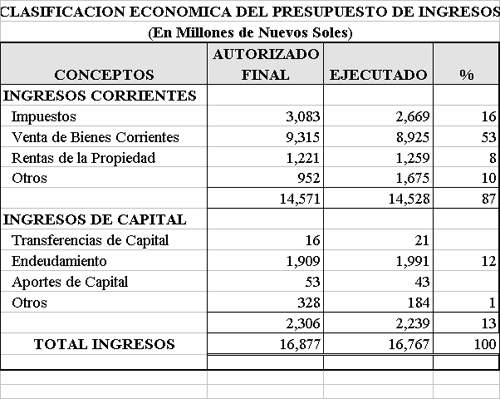 Los ingresos corrientes representan el 87% del total, y los rubros de mayor importancia están referidos a la venta de bienes corrientes (53%), impuestos (16%).