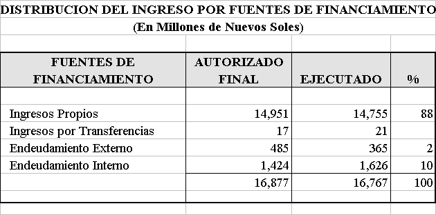 La fuente de endeudamiento contribuyó con el 12%, es especialmente el interno (10%), como se aprecia seguidamente en la distribución de los ingresos por fuentes de financiamiento.