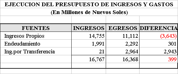 La Ejecución Presupuestaria muestra un Superávit de S/.399 millones, como consecuencia de un menor gasto en las fuentes de Ingresos Propios (S/. 3,643 millones), el mayor gasto se da por Endeudamiento (S/. 301 millones) e Ingresos por Transferencias (S/. 2,943 millones).