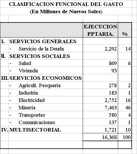 El gasto de la Actividad Empresarial del Estado, fue orientado en mayor proporción a atender servicios económicos destacando Minería en un 46% y Electricidad con 16%; además se atendió en servicio de la deuda en un 14%del total de gasto ejecutado respectivamente.