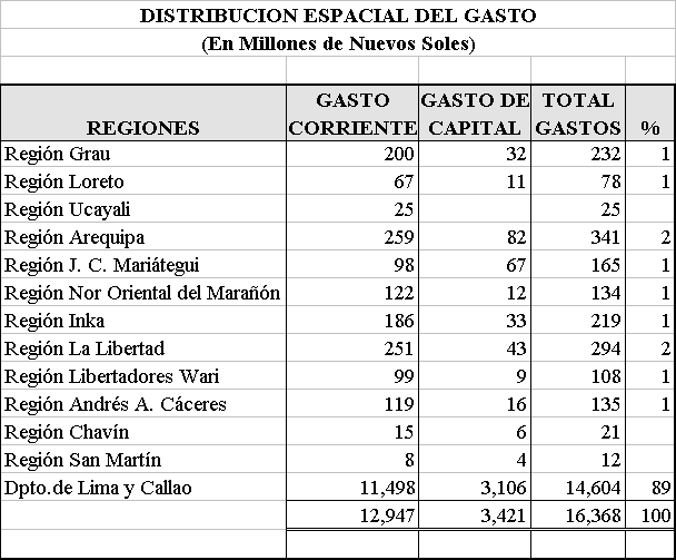 El total del gasto ejecutado en el período 1996, la Empresa del Estado de acuerdo a su ubicación geográfica regional muestran que la mayor distribución, se concentra en Lima y Callao debido a que cuenta con el mayor número de empresas, siendo 51, que representan el 89% respecto al total de gastos. Asimismo, los montos destinados a las regiones fueron ascendentes, con un ligero incremento en 1996 respecto al año anterior.