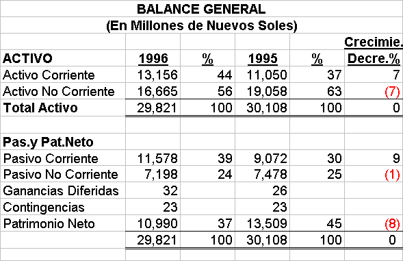 La estructura del total pasivo y patrimonio neto de 1996 ascendente a S/. 29,821 millones, está distribuído en S/.11,578 millones de pasivo corriente, que relacionado con el ejercicio de 1995, el cual alcanzó a S/.