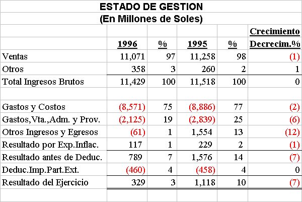El resultado del ejercicio fue en 1995 S/. 1,118 millones, mientras que en 1996 fue de S/.329 millones representando el 10% y 3% respectivamente de los ingresos brutos, mostrando un decrecimiento del 7% en relación al año anterior.