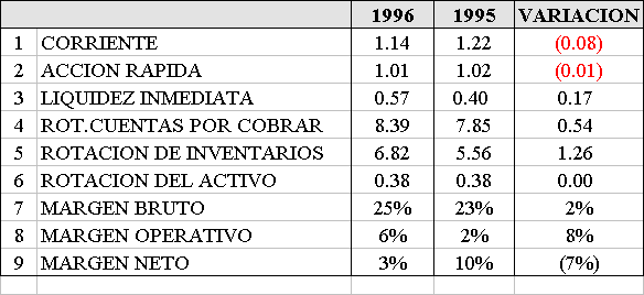 Como se puede apreciar, en los indicadores que seguidamente se muestra nos indican el comportamiento económico financiero del ejercicio 1996 comparado con el año 1995, así como los índices por sectores económicos.