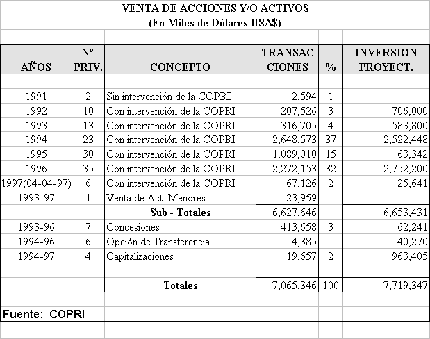 Como se puede apreciar, la COPRI, acumuló, por su parte, ingresos por US$ 7,065,346 mil dólares a través de 137 procesos de privatización, concesiones, opción de transferencia y capitalizaciones efectuadas entre 1991 y el Primer Trimestre de 1997, siendo el mayor número de privatizaciones entre los años 1994, 1995 y 1996, representando el 37%, 15% y 32%, respectivamente del total acumulado.