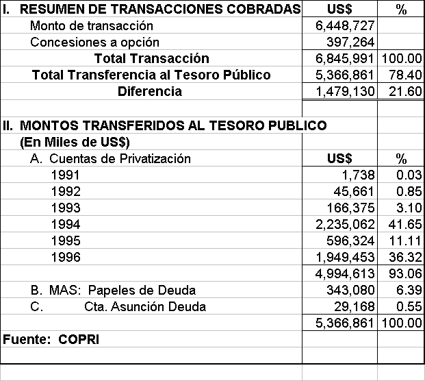 Como se aprecia, las transferencias efectuadas al Tesoro Público más significativas, se realizaron en los años 1994, 1995 y 1996, debido al mayor número de privatizaciones del orden de 23, 30 y 35 transacciones de venta de acciones y activos de las Empresas del Estado, respectivamente.