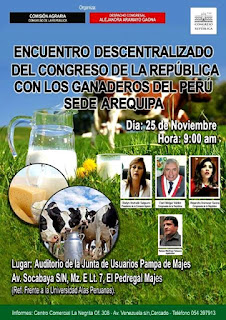 Estimados hermanos ganaderos y público en general nos vemos en el "I Encuentro del Congreso de la República del Perú con los ganaderos del Perú" acompañada de los congresistas Alejandra Aramayo y Elard Melgar. Este sábado 25 de Noviembre, Hora 9:00 a.m. Lugar: Auditorio de la Junta de Usuarios Pampa de Majes, Av. Socabaya S/N, Mz. E Lt. 7, El Pedregal Majes (Ref. Frente a la Universidad Alas Peruanas)
