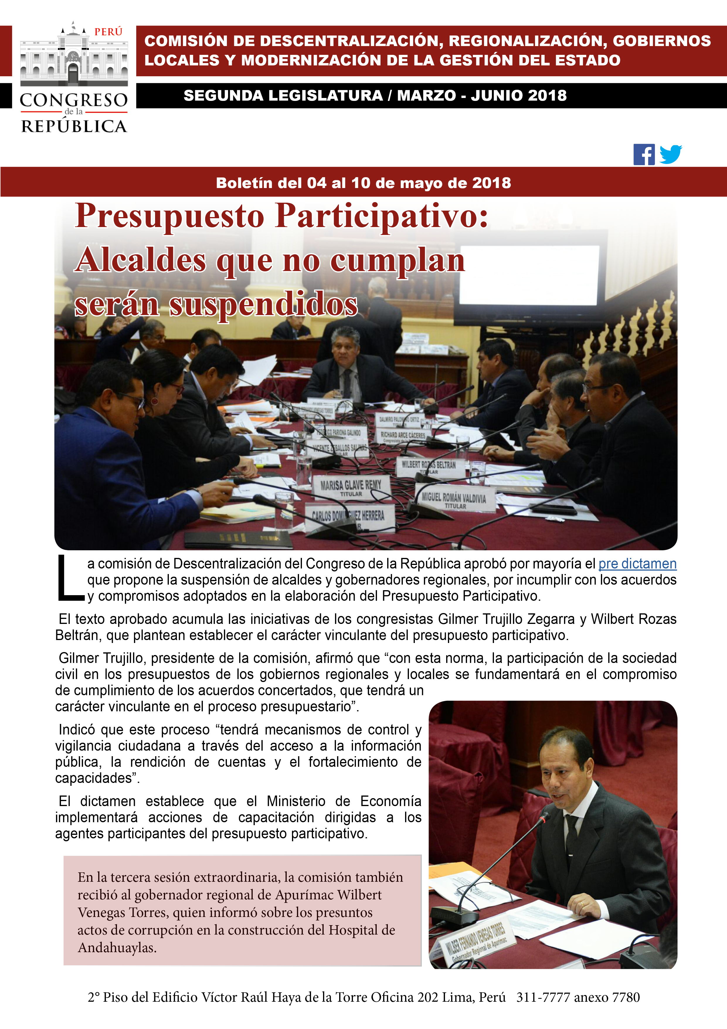 Es un honor y una gran responsabilidad asumir la presidencia de la comisión de Descentralización, Regionalización, Gobiernos Locales y Modernización de la Gestión del Estado. Agradezco la confianza de mis colegas congresistas de diferentes bancadas y confío en que nuestra labor cumplirá las expectativas de la población.
