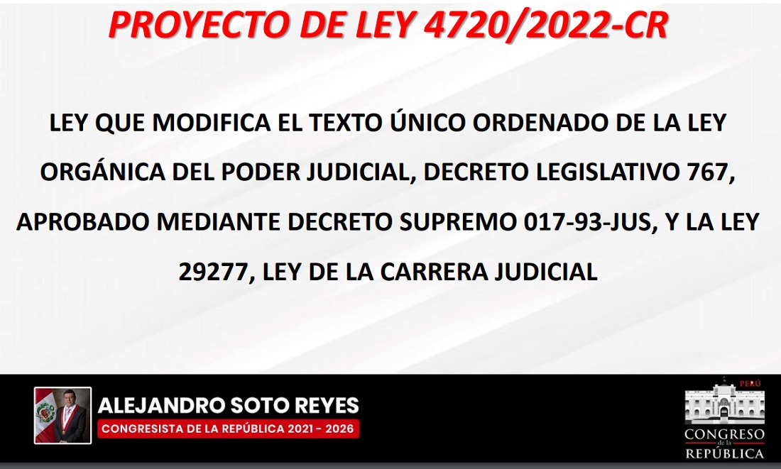 - El congresista Alejandro Soto Reyes, sustenta el Proyecto de Ley 4720/2022-CR, que propone modificar el texto único ordenado de la Ley Orgánica del Poder Judicial, Decreto Legislativo 767, aprobado mediante Decreto Supremo 017-93-JUS, y la Ley 29277, Ley de la Carrera Judicial.