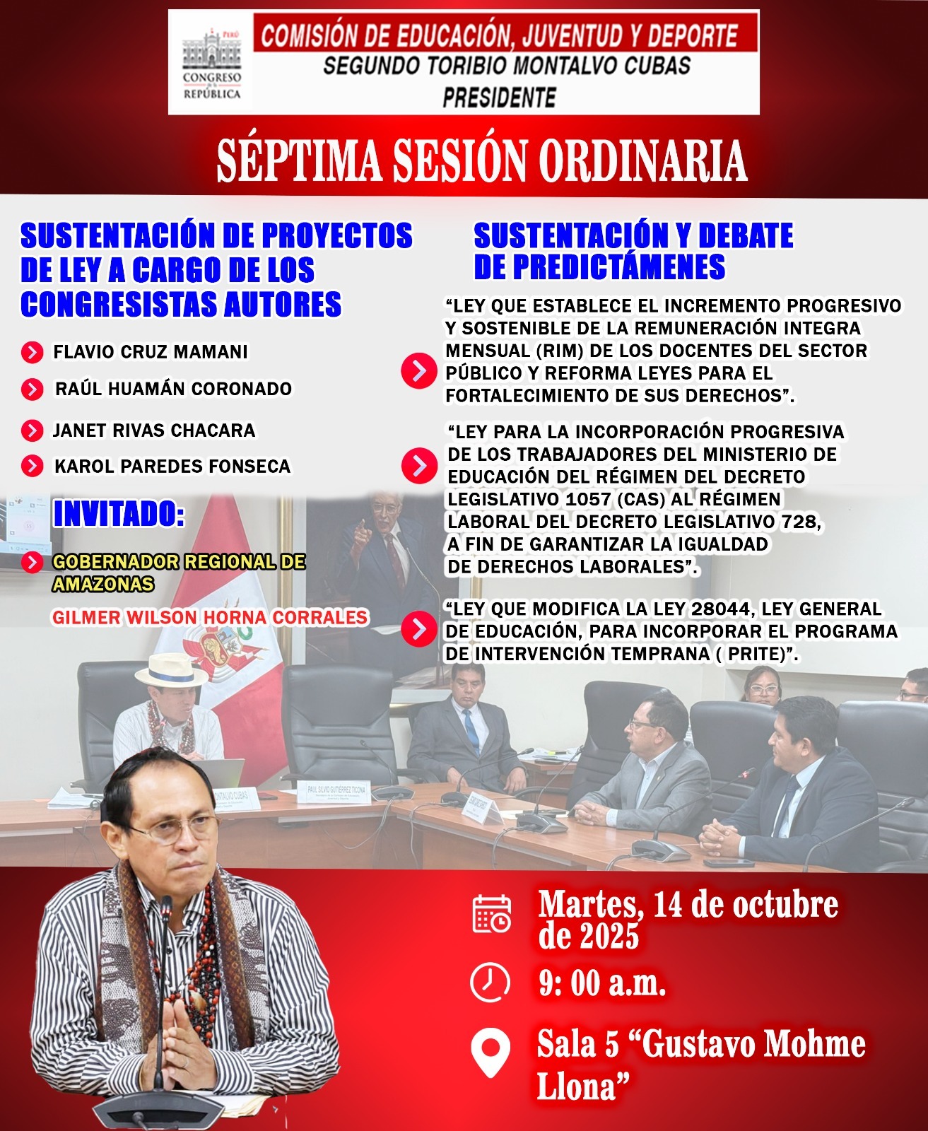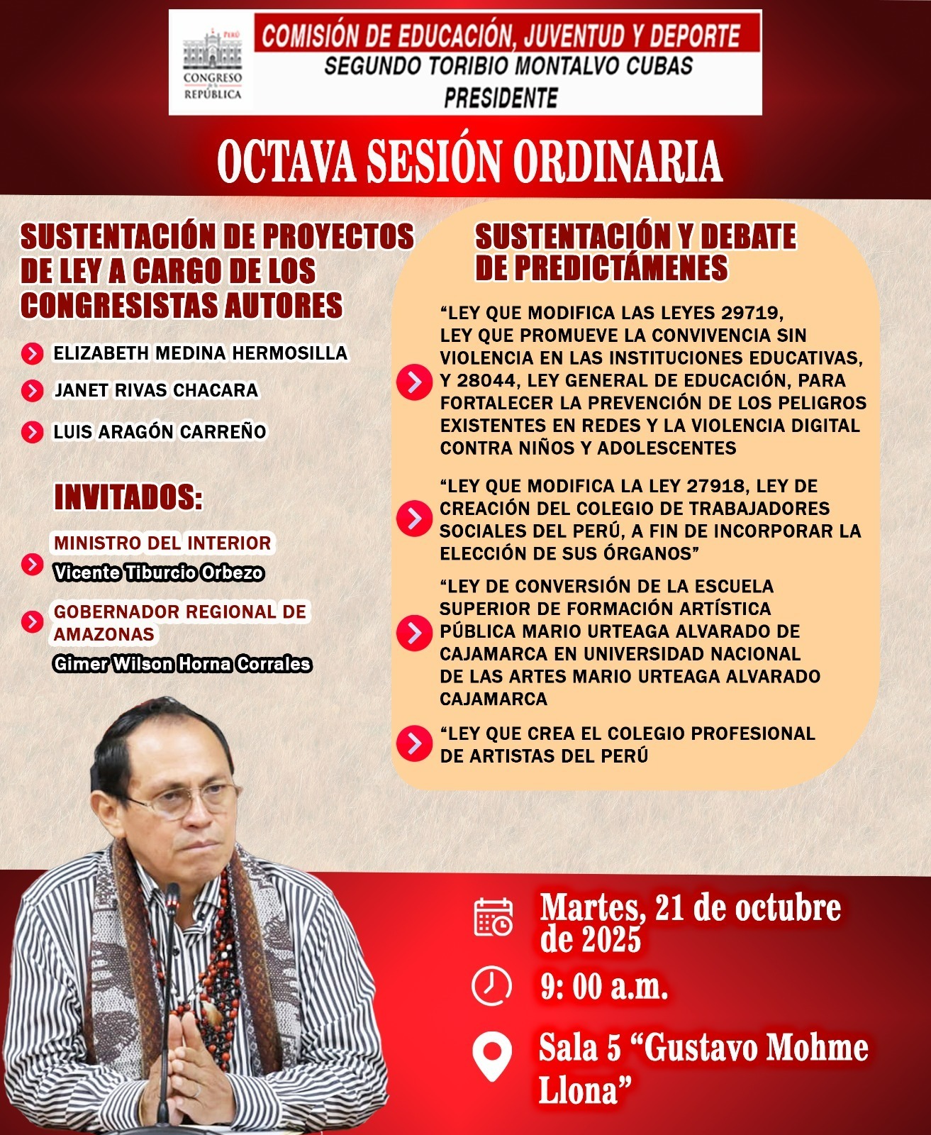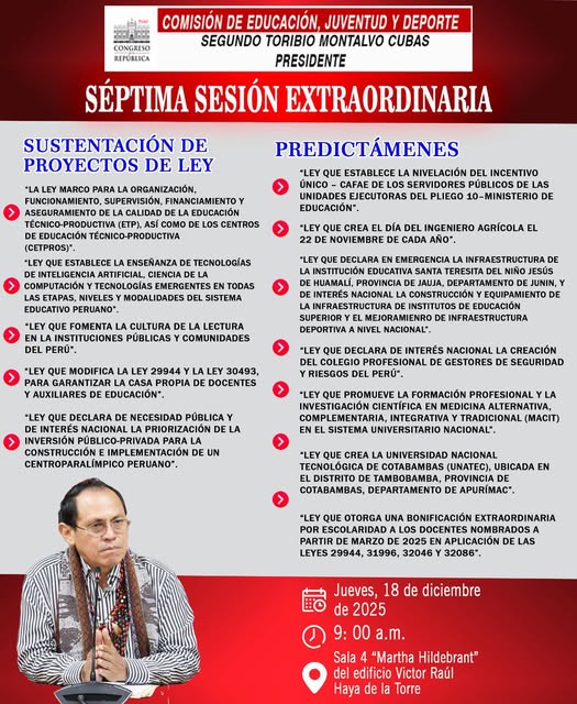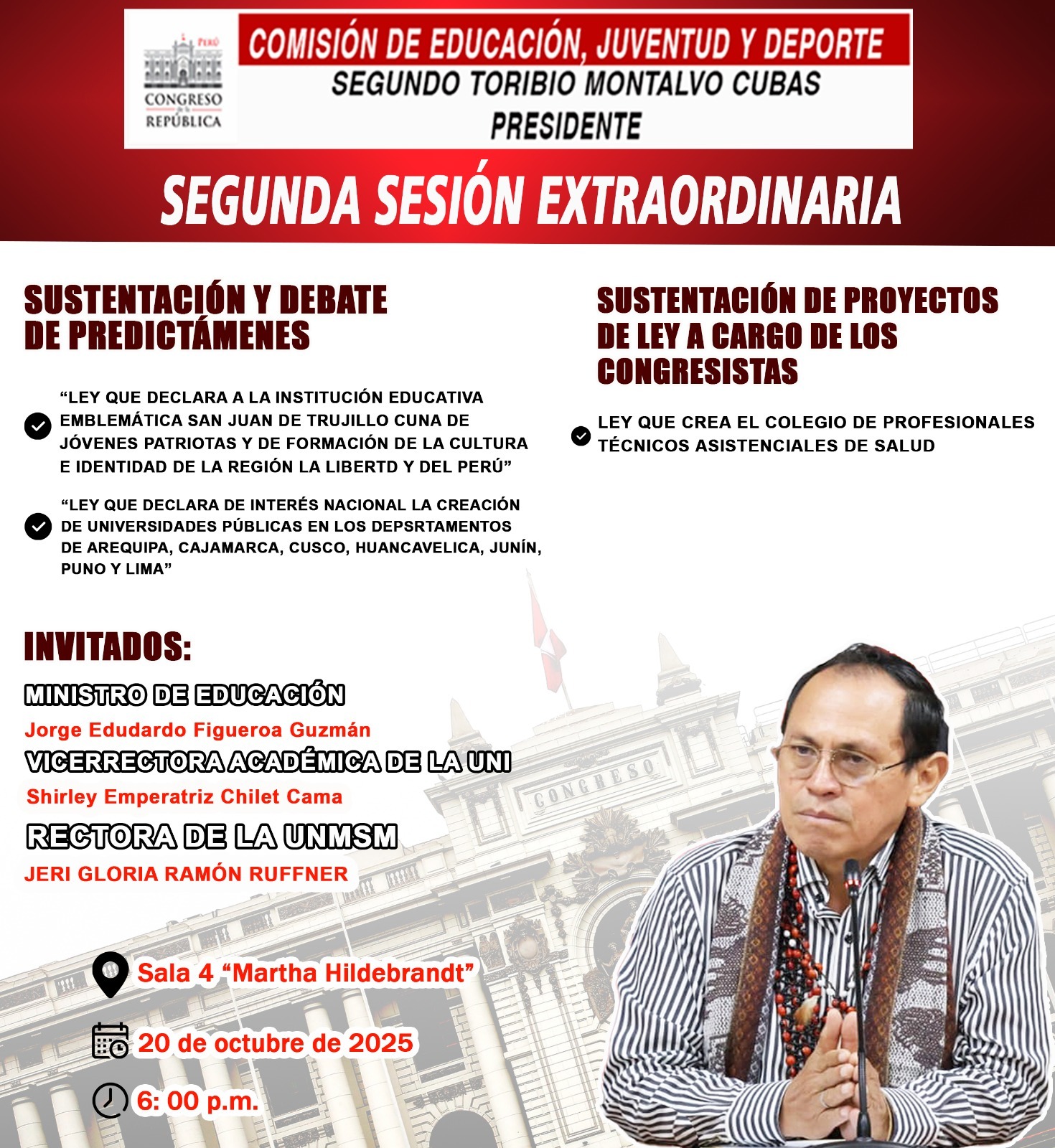En cuanto a la función de representación, la Comisión organiza audiencias públicas descentralizadas, foros macroregionales y mesas de trabajo en las zonas más afectadas por el analfabetismo y las brechas educativas. Ello permite recoger las demandas de estudiantes, docentes, jóvenes, deportistas y autoridades locales para transformarlas en iniciativas legislativas prioritarias. La realidad educativa muestra que solo el 63,3 % de los estudiantes culmina la secundaria, que cerca del 40 % de los jóvenes entre 15 y 29 años no accede a la educación superior y que un 18 % de la juventud forma parte del grupo de los “ninis” (que no estudian ni trabajan).