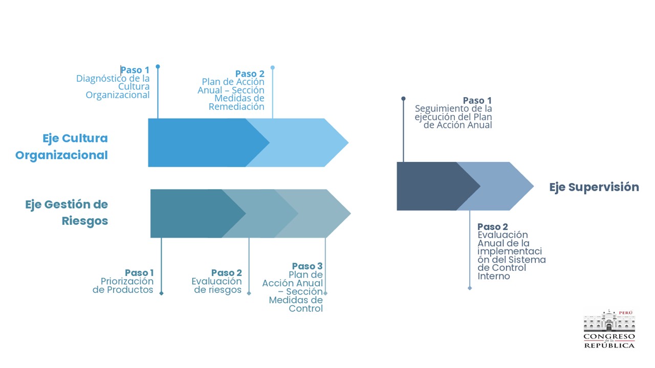 Para implementar el SCI, las entidades del Estado deben ejecutar los siguientes pasos establecidos por la Directiva 006-2019-CG/INTEG para cada uno de los 3 ejes: