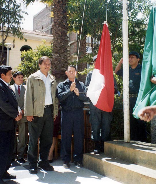 En la ceremonia del Izamiento del Pabellón Nacional el Congresista KUENNEN FRANCEZA M. en la localidad de Panao juntamente con el Alcalde Provincial Econ. RAMON MARCELO LAU.
