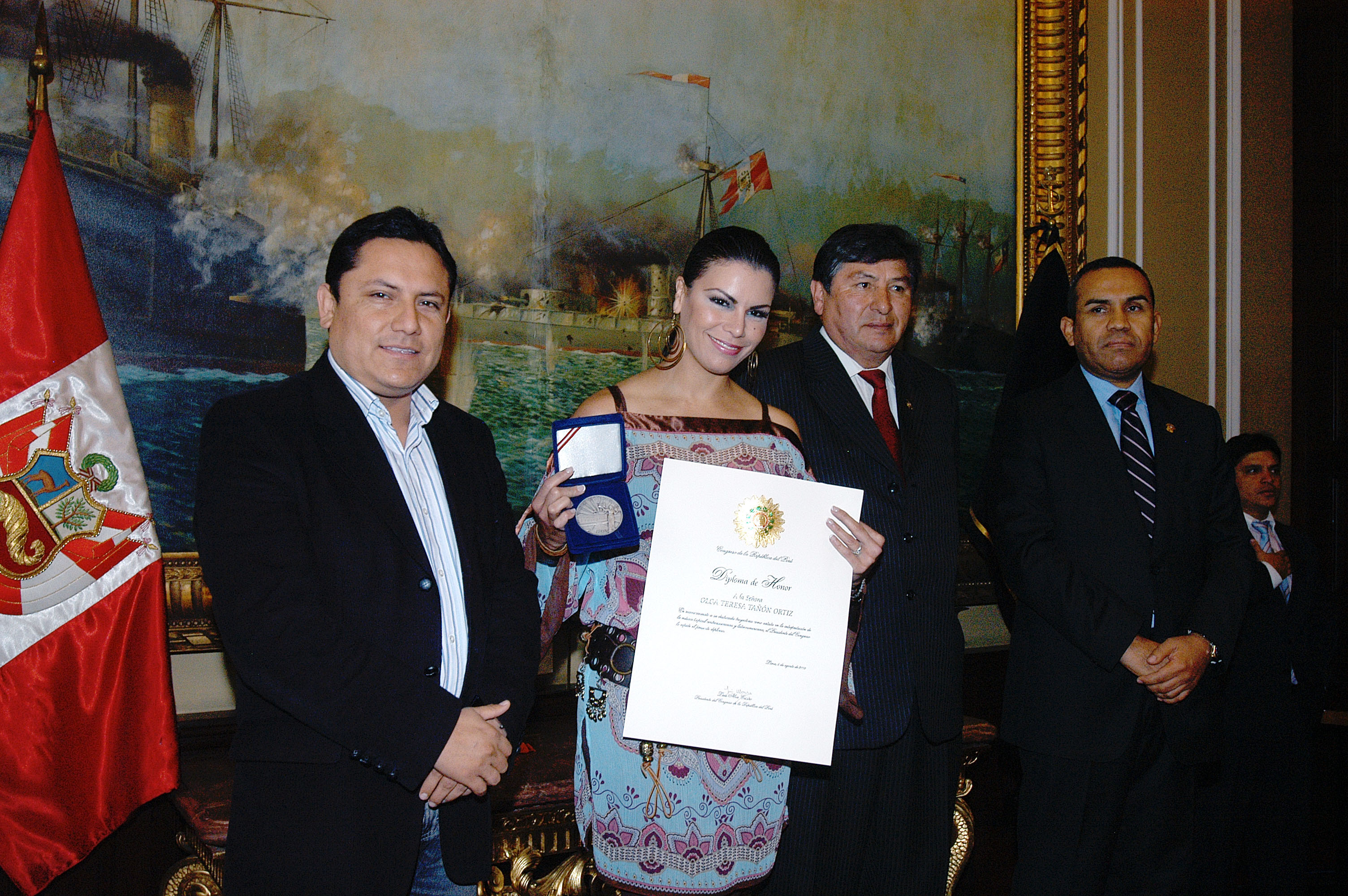 El Congreso de la República a través de su tercer vicepresidente, Antonio León Zapata, distinguió a la cantante puertorriqueña Olga Tañón. Acompañaron al parlamentario por Apurimac, los congresistas Álvaro Gutiérrez Cueva y Elías Rodríguez Zavaleta - 06 de agosto 2009