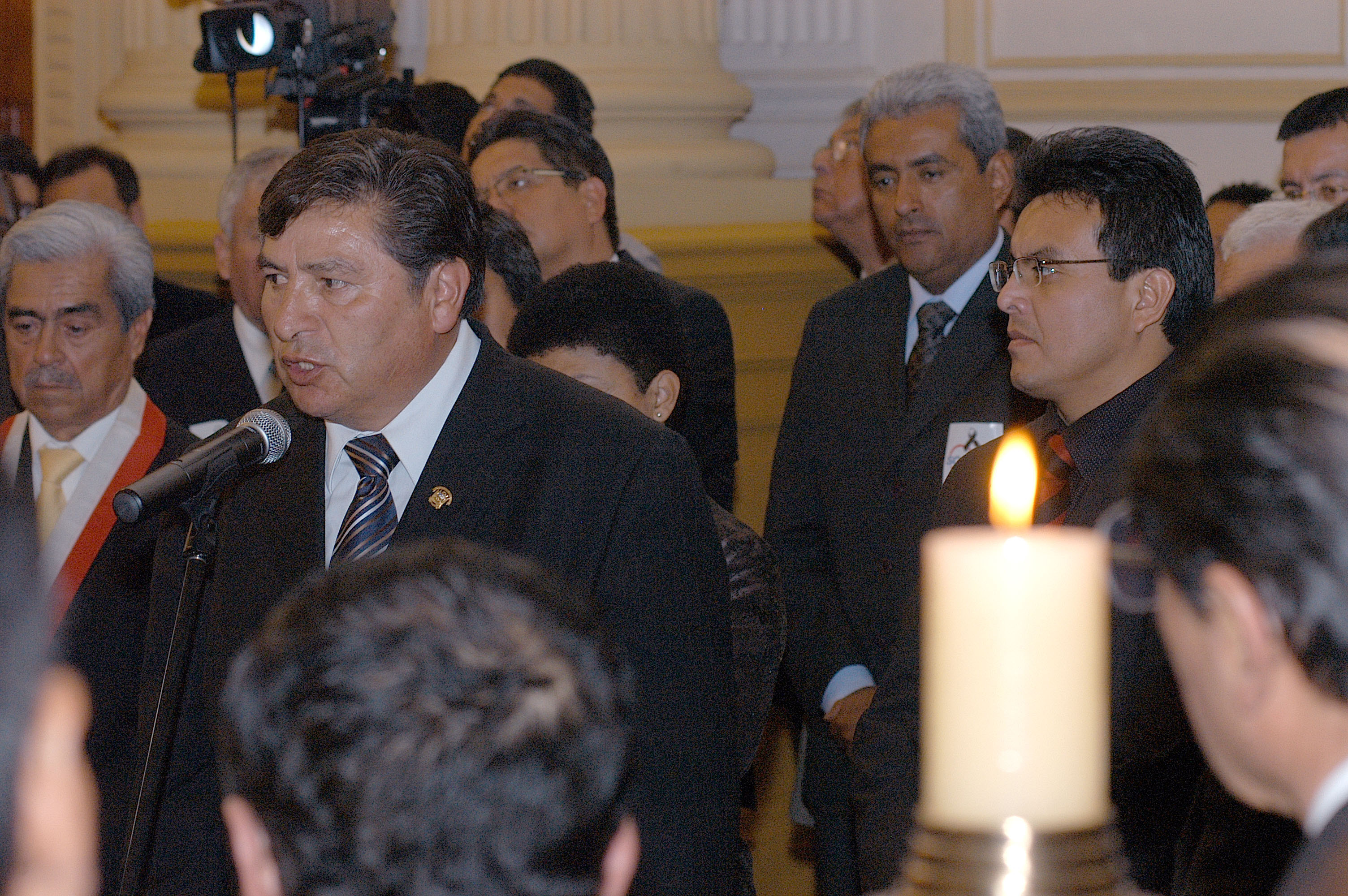 El presidente del Congreso de la República, Luis Alva Castro; el tercer vicepresidente, Antonio León Zapata; y los congresistas, Lourdes Alcorta, Mauricio Mulder y Carlos Cánepa, entre otros, encabezaron la bienvenida y homenaje al Señor de los Milagros, que visitó el Palacio Legislativo en una etapa de su tradicional recorrido procesional para recibir los testimonios de la fe y devoción de funcionarios y personal del Poder Legislativo – 18 de octubre 2009.