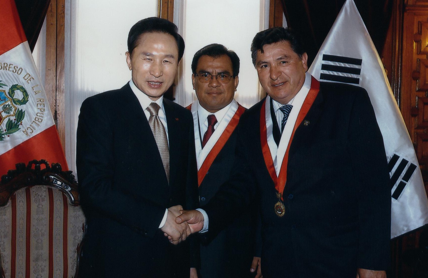 Congresista Antonio León Zapata, junto con el presidente de Corea, Lee Myung-bak y el presidente del Congreso, Javier Velásquez Quesquén, en su visita al Palacio Legislativo. 21-11-2008.