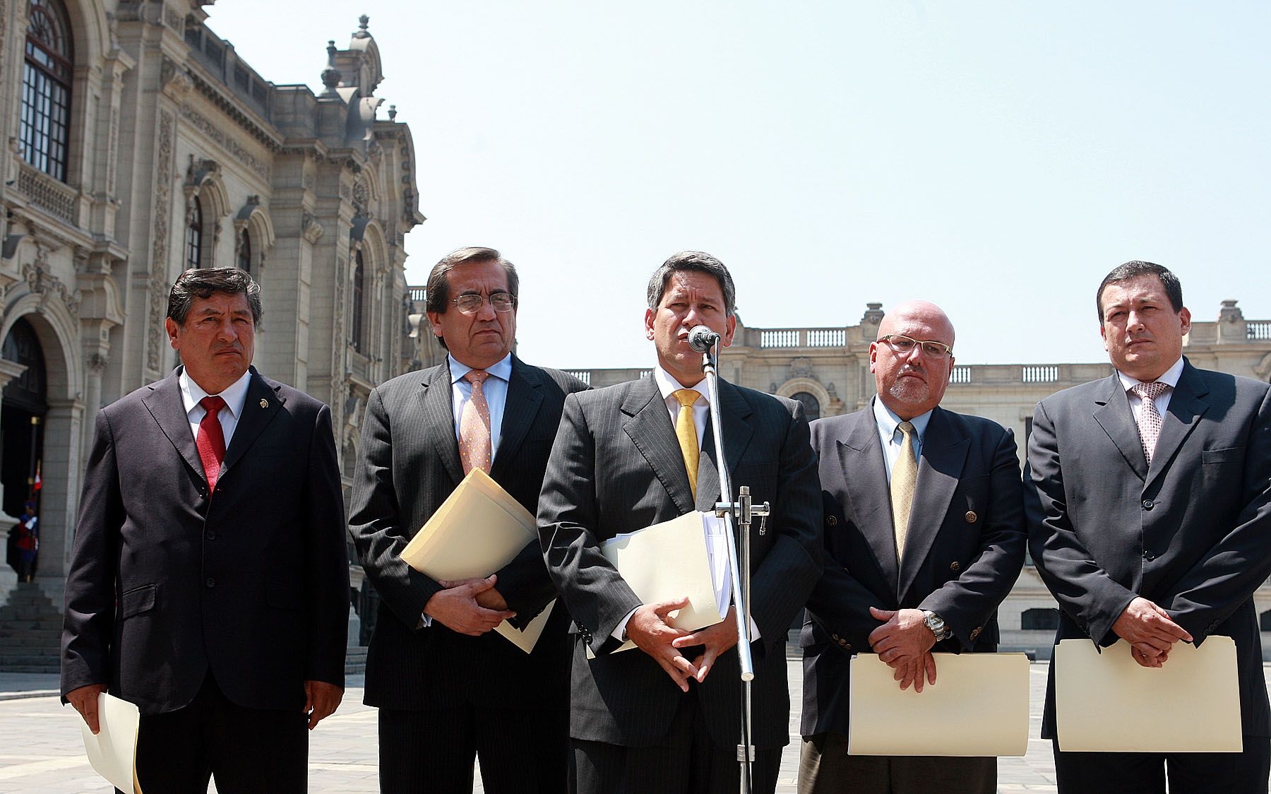 Comisión Multipartidaria del Congreso de la República encargada de monitorear Plan Anticrisis, ofreció declaraciones en el Patio de Honor de Palacio de Gobierno, después de entregar esta mañana al presidente Alan García Pérez, un paquete de propuestas como parte del trabajo que vienen realizando dicha comisión y en la que el Congresista Antonio León Zapata forma parte. En la propuesta se han considerado cuatro grandes ejes: protección de la familia, producción de más empleos, estímulo a la actividad privada y generación de mayores ingresos para el trabajador, las mismas que fueron acogidas de buena forma por el Presidente de la República. Lima 03 abril 2009. |