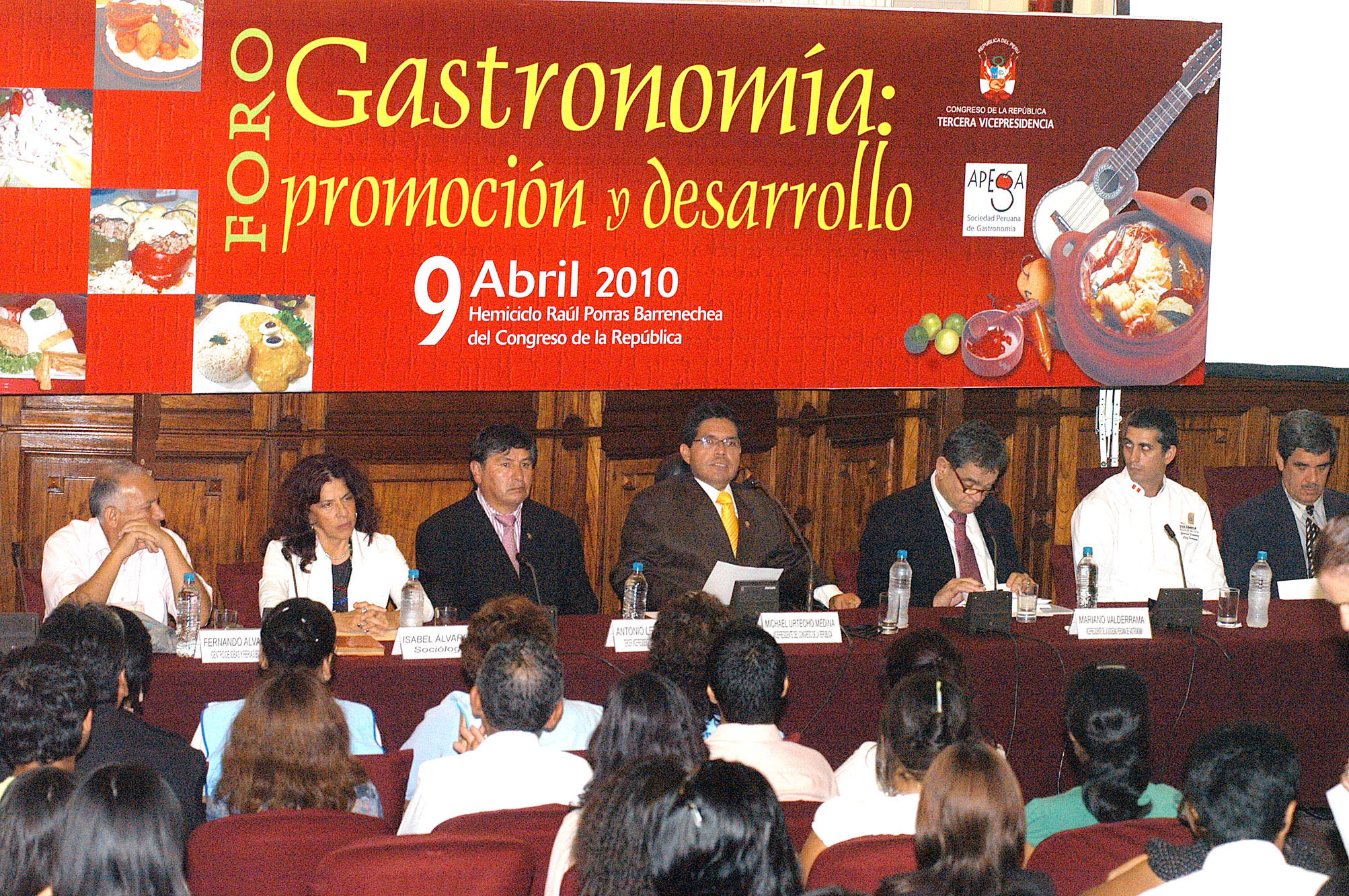 DEBATEN SOBRE GASTRONOMÍA PERUANA El congresista Antonio León Zapata, tercer vicepresidente del Congreso, organizó el Foro llamado “Gastronomía: Promoción y desarrollo”, en donde se resaltó la necesidad de continuar promocionando la cocina y los productos peruanos. El evento se realizó en el Hemiciclo Raúl Porra Barrenechea del Congreso de la República - 09 de abril 2010. |
