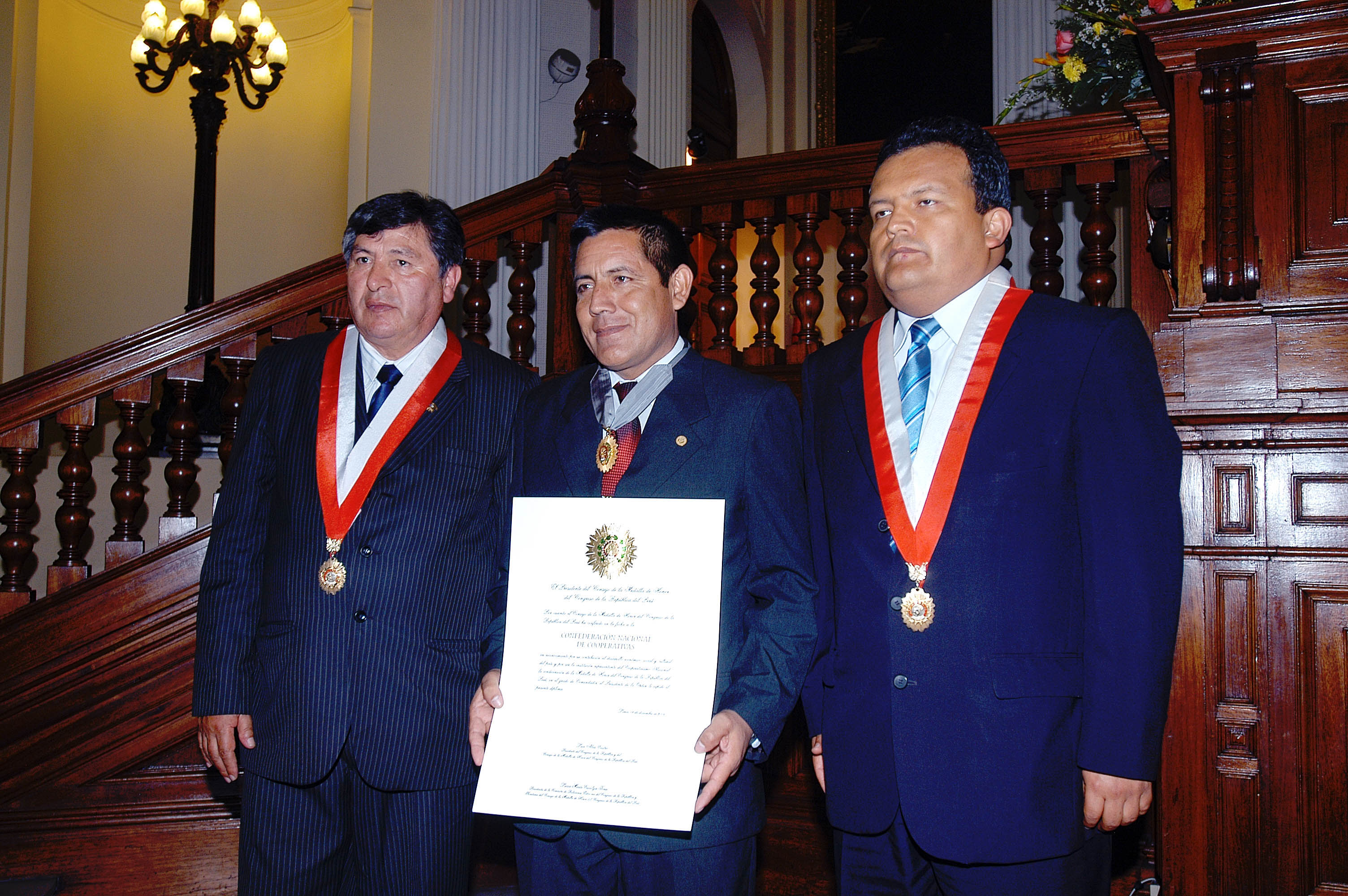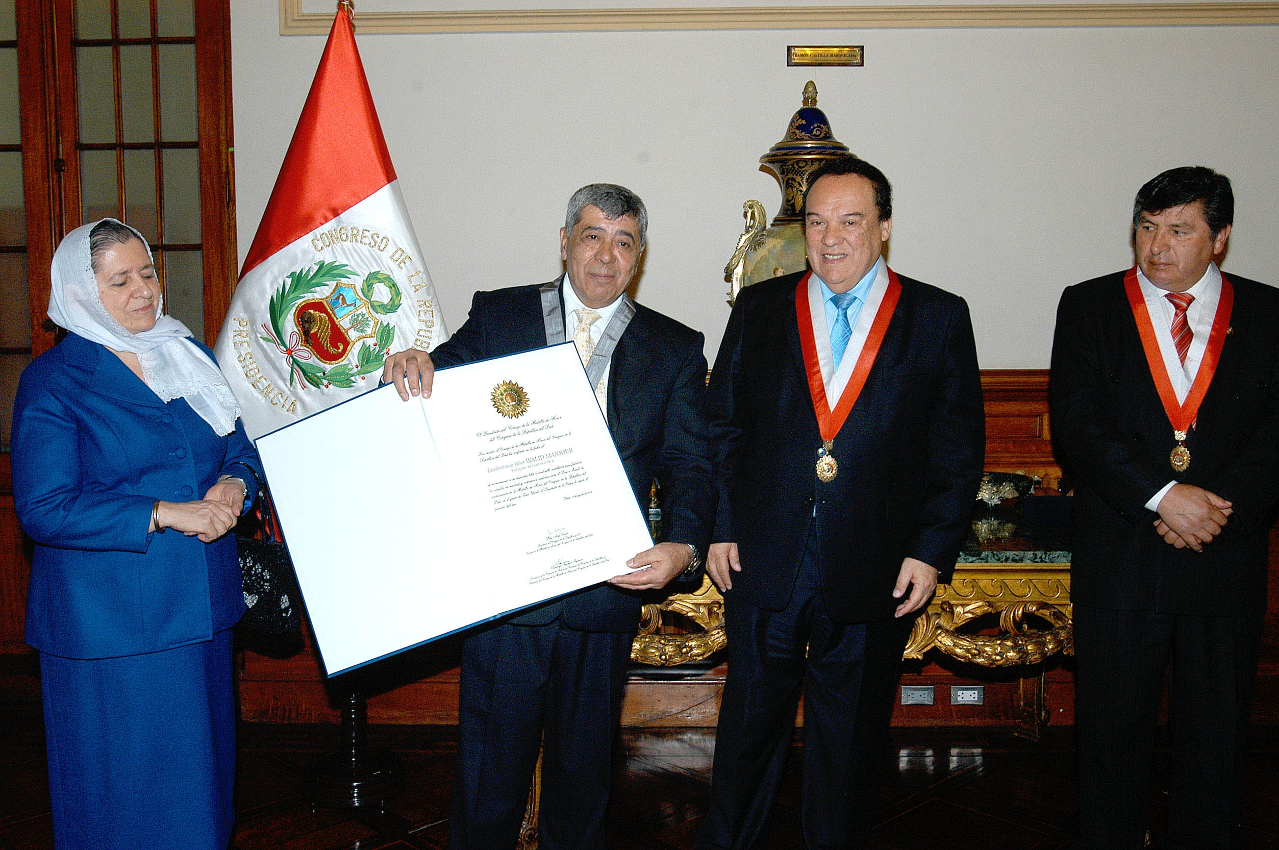 Con la Medalla de Honor del Congreso de la República, en el Grado de Gran Cruz, se condecoró al embajador de Israel en el Perú, Salid Mansur. Estuvieron presentes en el acto, el presidente del Parlamento Nacional, Luis Alva Castro y el tercer vicepresidente del Congreso Antonio León Zapata -12 de agosto 2009. |