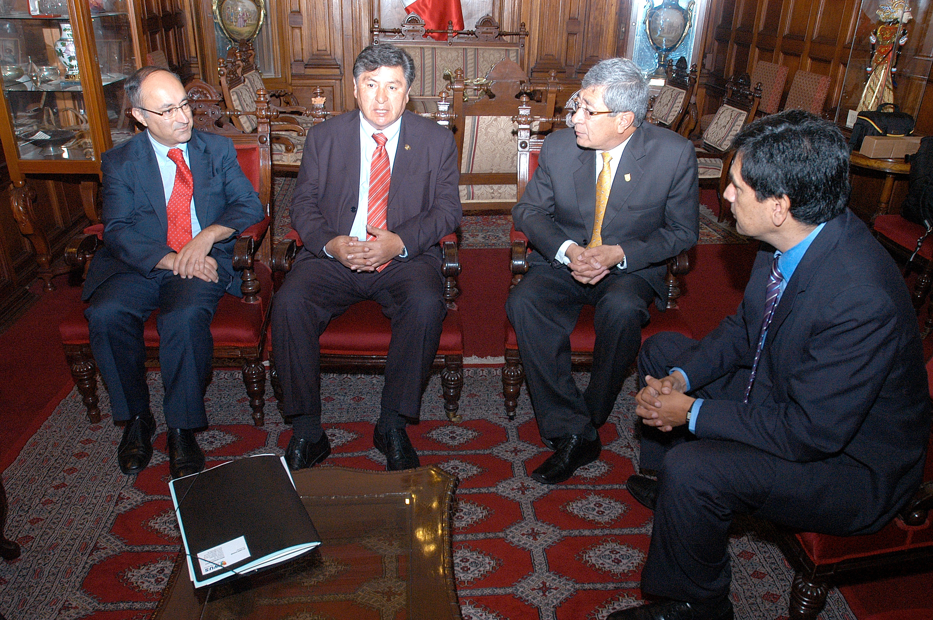 El tercer vicepresidente Antonio León Zapata, se reunió en la Sala de Embajadores del Palacio Legislativo con el alcalde distrital de La Punta, Wilfredo Duharte Gadea, y el representante en el Perú de la Misión Brandt de la República de Alemania, Alejandro Santa María Silva, con el fin de tratar sobre las becas que ofrece ese país europeo a los estudiantes peruanos – 01 octubre 2009 |