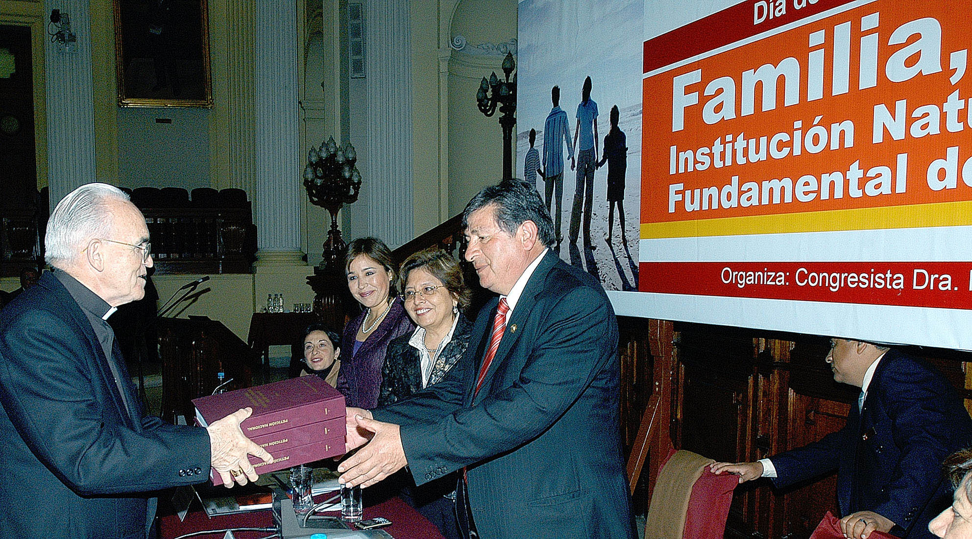 El tercer vicepresidente del Congreso, Antonio León Zapata, junto a la legisladora Fabiola Morales Castillo y la ministra de la Mujer y también congresista, Nidia Vílchez Yucra, recibieron del obispo de Chiclayo, Jesús Moliné Labarta, un petitorio con 33 mil firmas de ciudadanos lambayecanos en que plantean medidas en defensa de la familia y de la vida. El pedido se dio durante el desarrollo del foro sobre Familia, Institución Natural y Fundamental de la Sociedad, realizado en la Sala Raúl Porras Barrenechea – 11 de setiembre 2009. |