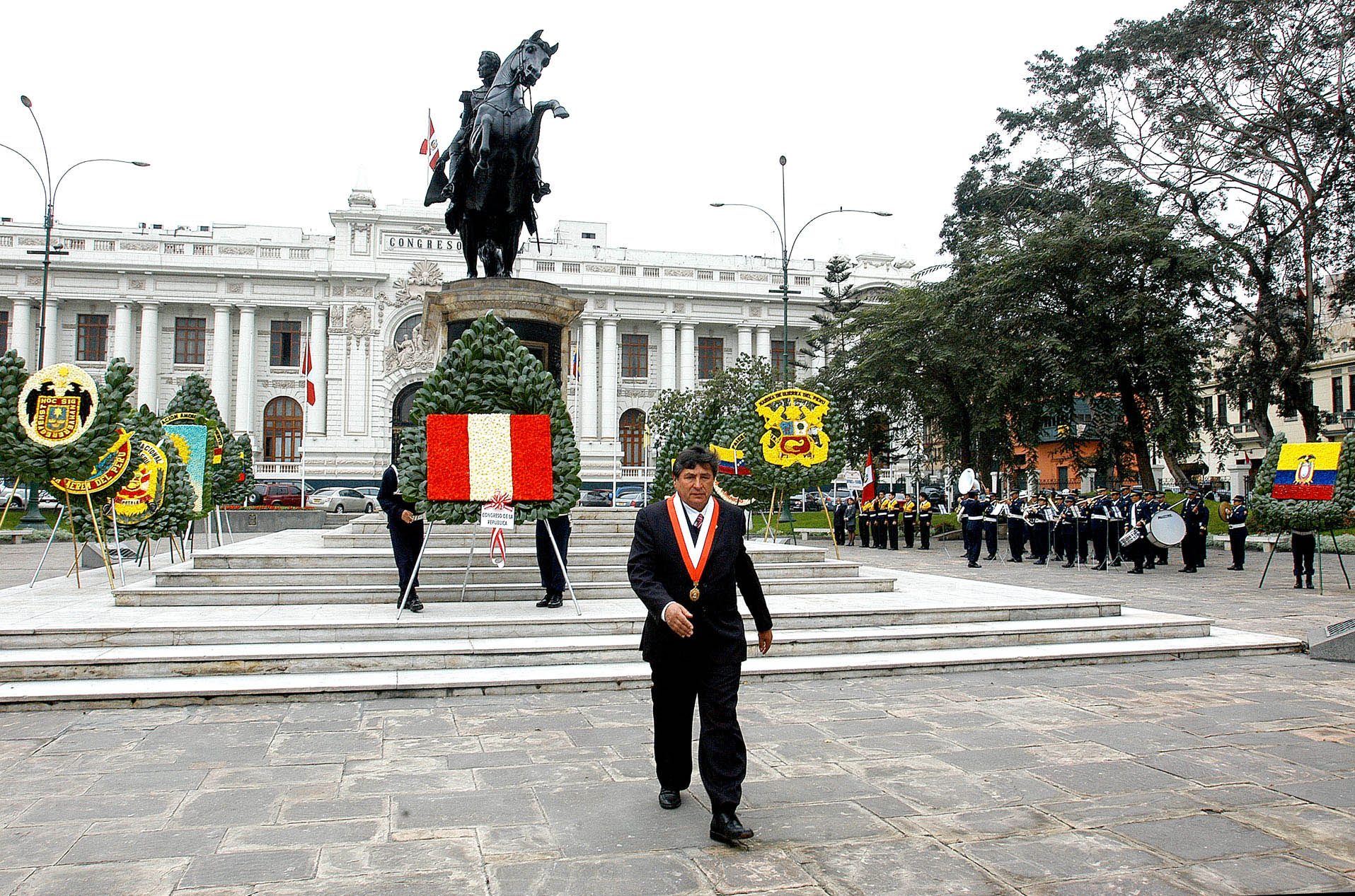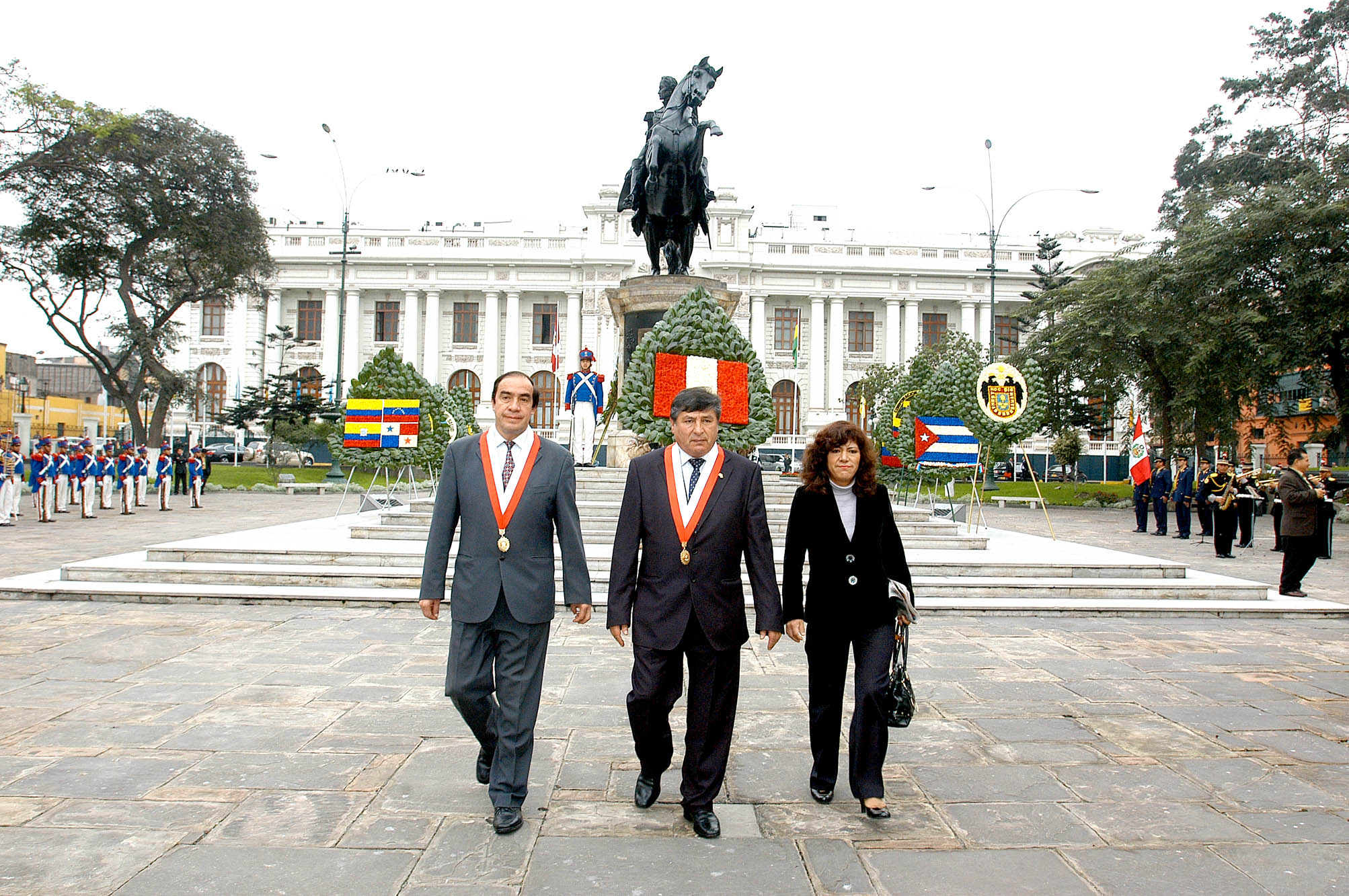 A nombre del Congreso de la República, el tercer vicepresidente Antonio León Zapata, acompañado por los Congresistas Martha Acosta Zárate y Yónhy Lescano Ancieta, rindieron homenaje al vecino país de Bolivia por el 184° Aniversario de su Independencia Nacional, depositando una ofrenda floral al pie del monumento al Libertador Simón Bolívar - 05 de agosto 2009. |