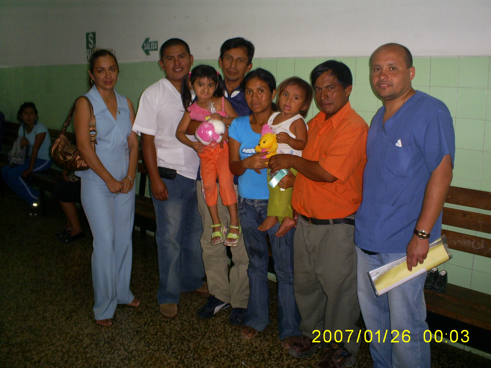 Congresista Marisol Espinoza en compañia de los Dres. José Pachas y Antonio Olavarria de Piura y los familiares con sus pacientes que fueron intervenidos con exito en el Hospital cayetano Heredia |