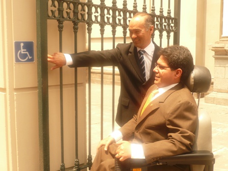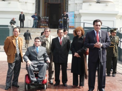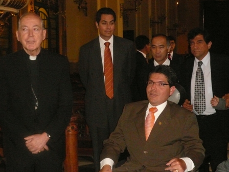 Ing. Michael Urtecho Medina Presidente de la Comisión Especial de Discapacidad del Congreso, Dr. Guillermo Vega Espejo Presidente del Consejo Nacional para la Integración de la persona con discapacidad – CONADIS, y el Cardenal de Lima, entre otras autoridades, participaron en la inauguración la de rampa para personas con discapacidad en la Catedral de Lima el día 15 de diciembre del 2008. |