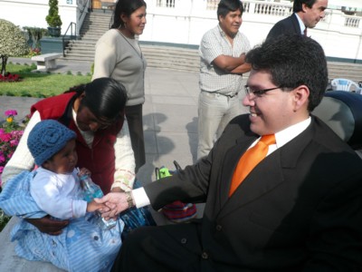 Ing. Michael Urtecho Medina Presidente de la Comisión Especial de Discapacidad del Congreso, con el apoyo del Congreso de la República, Cooperación Internacional y empresas privadas, realizó el I Concurso Nacional de Proyectos innovadores denominado “Mentes Brillantes”, a favor de las Personas con discapacidad, donde 25 finalistas de diversas provincias del Perú, se dieron cita en la Plaza José Faustino Sánchez Carrión del Congreso para exponer sus brillantes iniciativas. 16/12/08. |