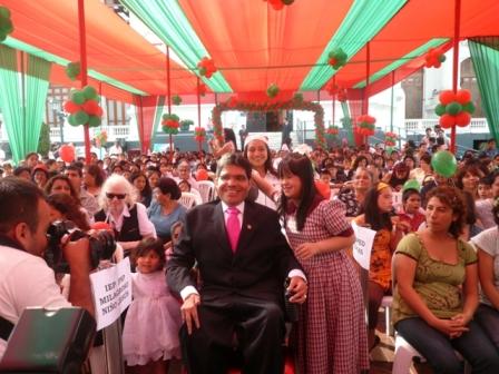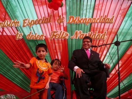Los niños símbolos de la Teletón 2008 “Dilver y Diana”, acompañaron al Congresista Michael Urtecho Medina, en la Chocolatada para niños con discapacidad denominada: “GOTITAS DE AMOR”, que realizó la Comisión Especial de Discapacidad del Congreso en la Plaza José Faustino Sánchez Carrión el día 12 de diciembre del 2008. |