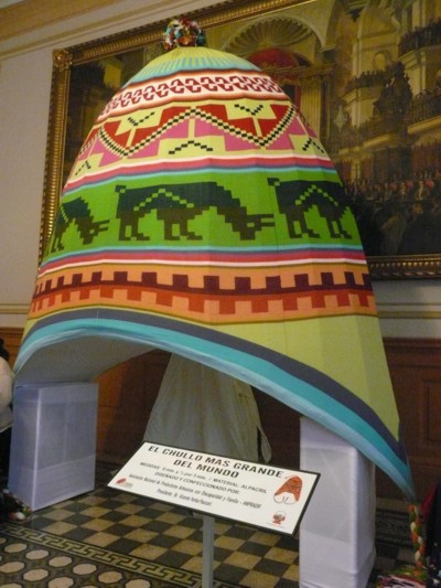 A iniciativa de la Comisión Especial de Discapacidad del Congreso, que preside el Congresista Michael Urtecho Medina, presentó el Chullo más grande del mundo elaborado por artesanos de la Asociación Nacional de Productores con Discapacidad y Familia que preside el Sr. Vicente Yerba, este símbolo emblemático de la artesanía Peruana mede 6 metros de alto y 3.5 de ancho, el mismo que se busca exhibir en el Foro de Cooperación Económica Asia Pacífico – APEC, con la finalidad de promover las habilidades y el trabajo profesional que poseen las personas con discapacidad, 30/10/08. |