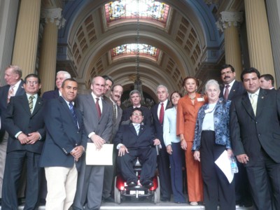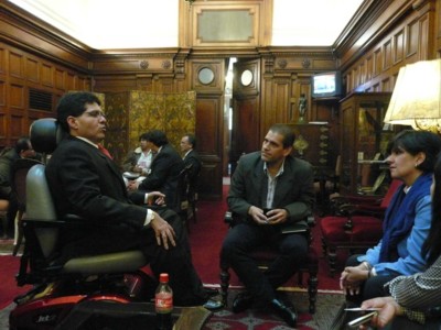 Congresista Michael Urtecho, presidente de la Comisión Especial de Discapacidad del Congreso, organizó la Mesa de Trabajo sobre Sordoceguera, con la finalidad de debatir y mejorar el Proyecto de Ley que busca reconocer a la sordoceguera como discapacidad única. En dicha mesa estuvieron presentes el director de Sense Internacional para América Latina, Dr. Ricardo Zevallos, y diferentes representantes de este colectivo. Esta mesa de trabajo se realizó en la Sala Bolognesi del Palacio Legislativo. 24/11/08. |