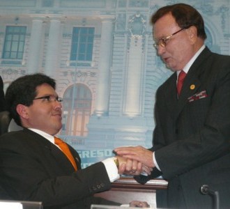 El Presidente de Directorio de la Caja Trujillo Sr. Boris Ytzkovich saluda al Congresista Urtecho durante el lanzamiento de la campaña “CREDIAMIGO”, donde la partida inicial de esta línea de créditos es de un millón y medio de soles exclusivamente para incrementar los negocios del colectivo de discapacidad de todo el país. 27/08/08.