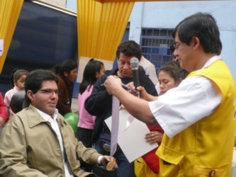 El Decano del Colegio Odontológico del Perú - Región Lima, Dr. Miguel Ángel Saravia Rojas, hizo entrega de una medalla de honor al Congresista Urtecho durante el desarrollo de la I Campaña de Salud Bucal “UNA SONRISA ESPECIAL” para personas con discapacidad en San Luis, dicha campaña fue organizada por la Comisión Especial de Discapacidad del Congreso la cual preside el Congresista Urtecho. 28/09/08. |