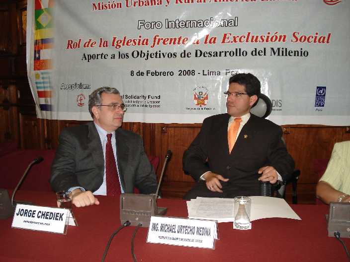 El día 08 de febrero de 2008, en el Hemiciclo Raúl Porras Barrenechea del Congreso de la República, el Congresista Michael Urtecho Medina, acompañado del Sr. Jorge Chediek Representante Residente de las Naciones Unidas para el Desarrollo PNUD, inauguró el Foro Internacional "Rol de la Iglesia frente a la Exclucisión Social", |