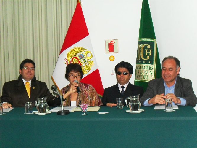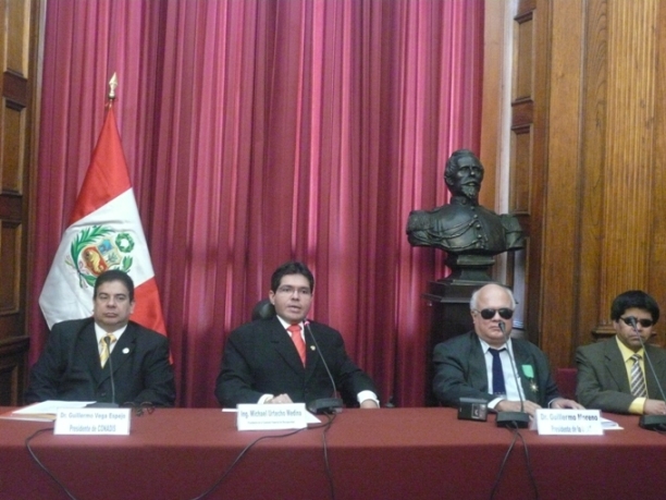Participaron en el I Encuentro Internacional por el Desarrollo Inclusivo de las personas Ciegas: El Congresista Michael Urtecho Medina Presidente de la Comisión Especial de Discapacidad – CODIS, Dr. Guillermo Vega Espejo Presidente del CONADIS, Dr. Guillermo Moreno (Panamá) Presidente de la Unión Latinoamericana de Ciegos ULAC, entre otros, realizado el día 30 de abril del presente en la Sala Francisco Bolognesi del Palacio Legislativo. |