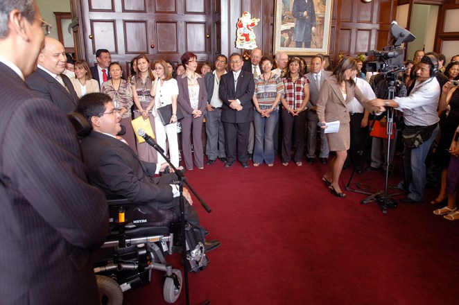 Con el objetivo de promover una amplia participación y discusión entre los diversos actores del gobierno y de la sociedad civil, respecto a la generación de herramientas indispensables para monitorear y evaluar los avances de la implementación de la Convención sobre los derechos de las personas con discapacidad – CDPD y del Plan de Igualdad de Oportunidades para personas con discapacidad 2009-2018 – PIO. Todo ello, en el marco del Proyecto CONGRESO – PNUD “Apoyo a los procesos de implementación y monitoreo de la CDPD y PIO”, el Segundo Vicepresidente del Congreso realizó el evento: SOCIALIZACIÓN DE LAS PROPUESTAS. 16.12.09. |
