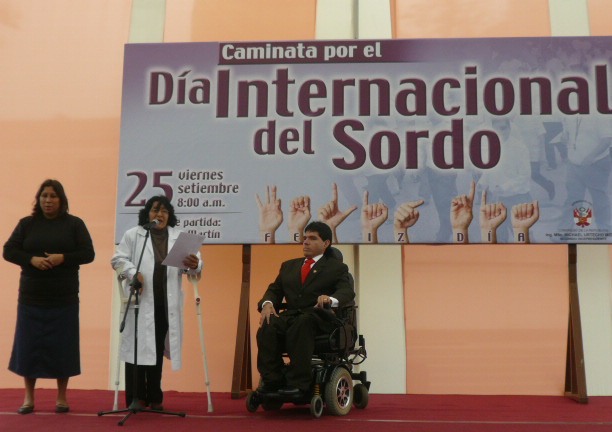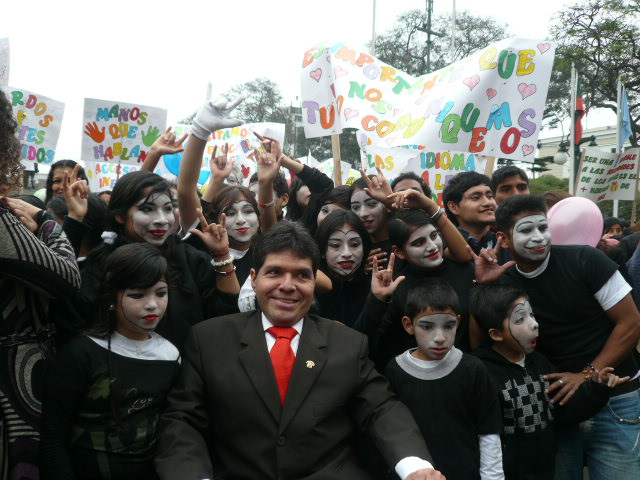 La comunidad sorda del Perú entregó un memorial al Vicepresidente del Congreso, Ing. Michael Urtecho Medina, durante la ceremonia por el Día Internacional de las Personas Sordas en la Plaza José Faustino Sánchez Carrión del Palacio Legislativo. 25.09.09. |