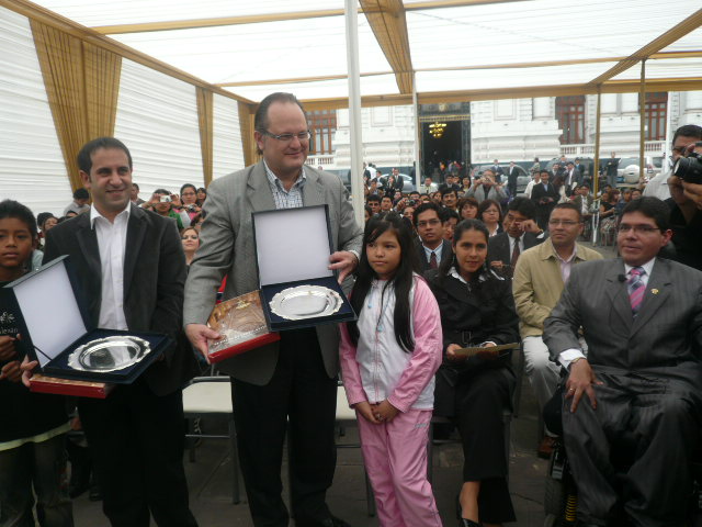 Niños con discapacidad hacen entrega de platos recordatorios y libros “El Palacio Legislativo” al Cantautor de Música Cristiana Marcos Witt y al Pastor Lucas Leys, durante una ceremonia de Condecoración organizada por el Segundo Vicepresidente del Congreso Ing. Michael Urtecho Medina. 27.11.09. |