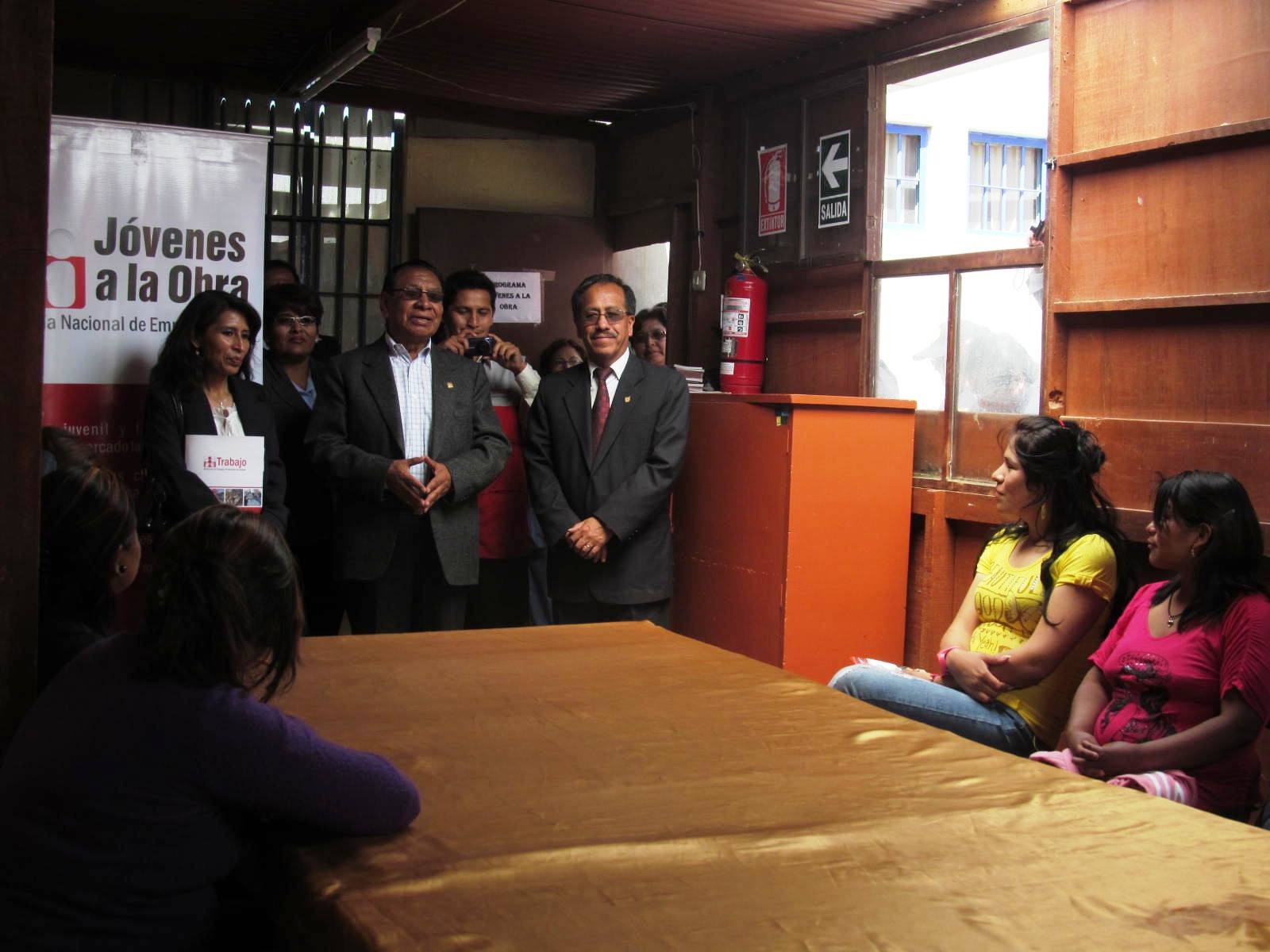 El congresista Justiniano Apaza Ordóñez inauguró el programa nacional de empleo juvenil “Jóvenes a la obra” junto a la directora del programa, Marisol Velásquez Mazca, y el alcalde de la Municipalidad de Socabaya, Wuiber Mendoza Aparicio. Fecha: 24/10/2012 |