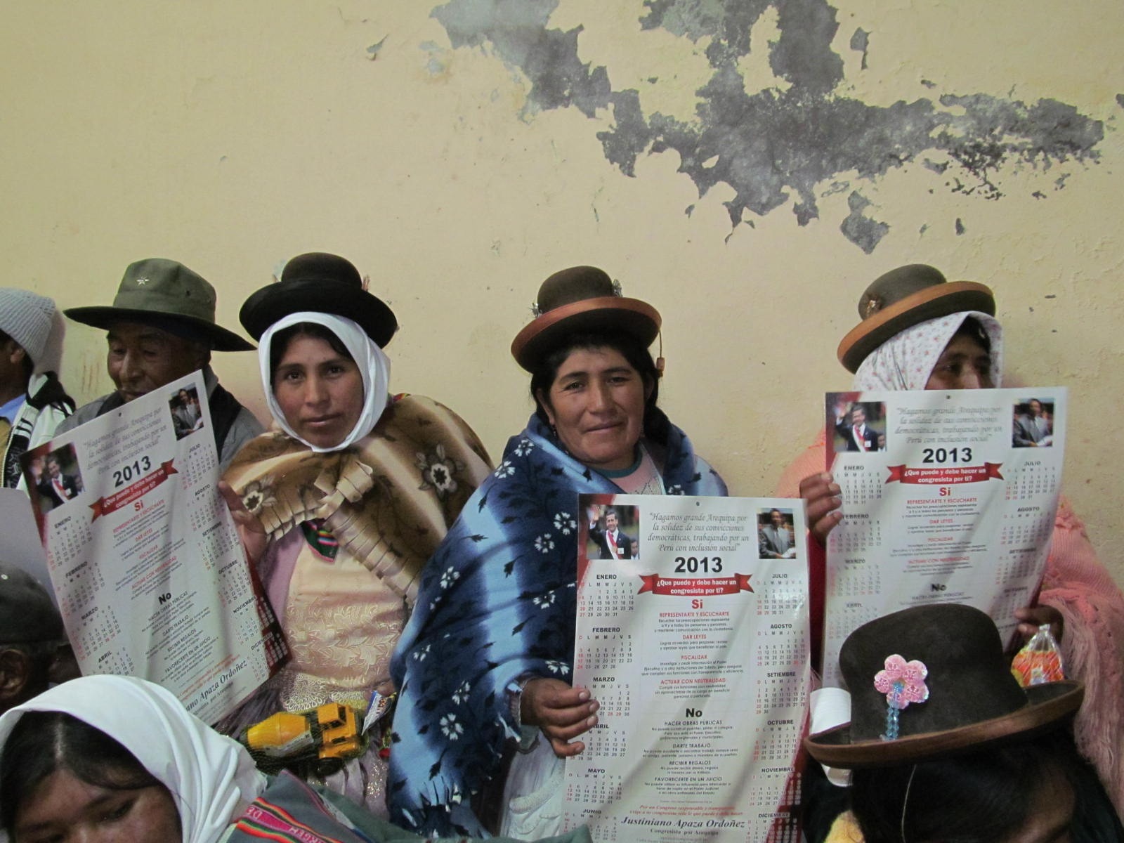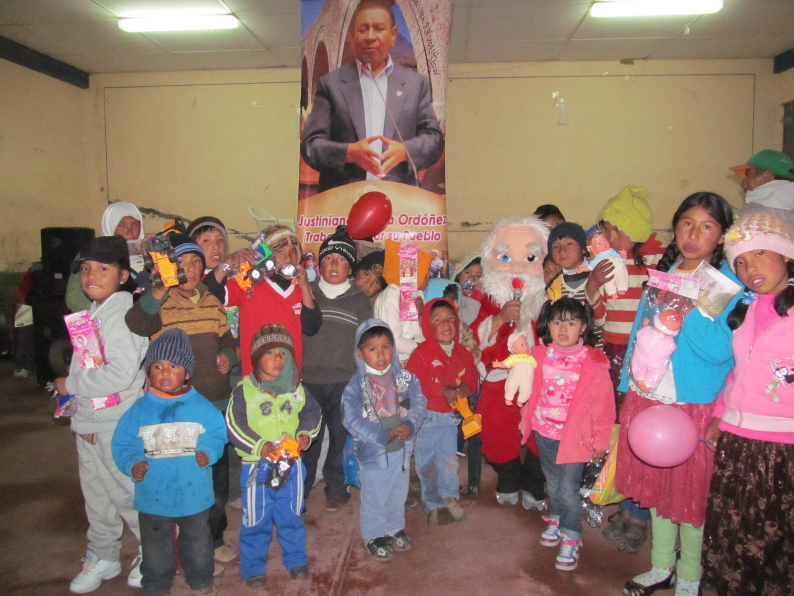 Actividad Navideña en San Juan de Tarucani y Salinas Huito. El Congresista Justiniano Apaza Ordóñez realizó una chocolatada navideña y entrega de regalos para las familias de San Juan de Tarucani en Arequipa, en coordinación con las autoridades del distrito. El evento, realizado el sábado 22 desde las 11:00 hasta las 13:00 horas, contó con la presencia de alrededor de 150 niños y sus familiares, los cuales disfrutaron de juegos y concursos, en los cuales se distribuyeron diferentes juguetes de acuerdo a las edades, entre los que se encontraban muñecas, carritos y pelotas AMPLIAR FOTOGRAFIA . . Fecha: 03/01/2013 |